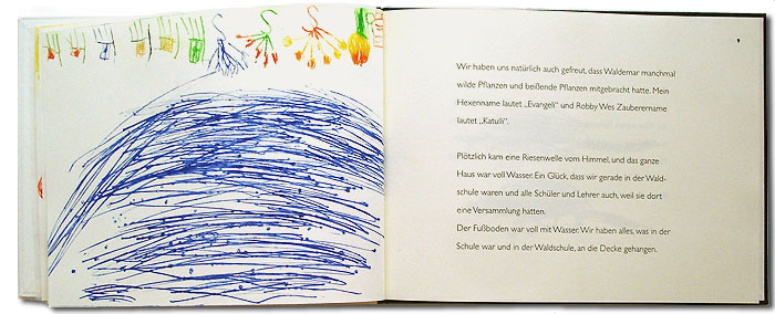 Wir haben uns natürlich auch gefreut, dass Waldemar manchmal wilde Pflanzen und beißende Pflanzen mitgebracht hatte. Mein Hexenname lautet »Evangeli« und Robby Wes Zauberername lautet »Katulli«. Plötzlich kam eine Riesenwelle vom Himmel, und das ganze Haus war voller Wasser. Ein Glück, dass wir gerade in der Waldschule waren und alle Schüler und Lehrer auch, weil sie dort Versammlung hatten. Der Fußboden war voll mit Wasser. Wir haben alles, was in der Schule war und in der Waldschule, an die Decke gehangen.