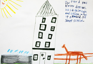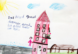 Das Pferd grast hinter dem Haus. Ich liege im Haus und schlafe. Im Pool ist niemand. Die Sonne scheint. Das Pferd grast immer noch. Ich gehe baden im Pool.