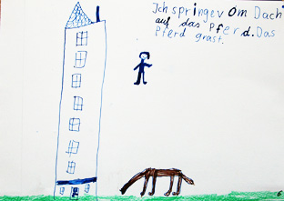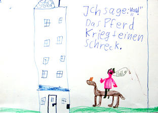 Ich springe vom Dach auf das Pferd. Das Pferd grast. Ich sage: »Hallo!« Das Pferd kriegt einen Schreck.