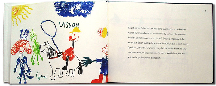 Es gab einen Schulhof, der war ganz aus Gummi – die Fenster waren Türen und man musste immer zu seinem Klassenraum hüpfen. Beim Essen mussten sie aufs Dach springen weil da oben das Essen ausgegeben wurde. Natürlich gab es auch einen Spielplatz, aber der war eine Etage höher als das Essen. Er war auf einem Baum. Es gab auch eine Waldschule, die war mit in die große Schule eingebaut.